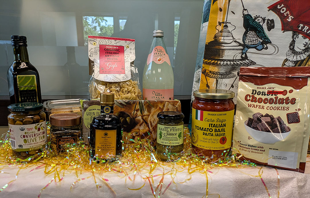 - Includes: 1 bag of Gigli pasta, green olive flatbread crackers, a container of mini almond biscotti, a bag of double chocolate wafer cookies, a bottle of balsamic vinegar, a jar of basil pesto, one bottle of Italian grapefruit soda, a jar of olives, a bottle of extra virgin olive oil, sofrito seasoning blend, a jar of tomato basil pasta sauce and a reusable Trader Joe’s grocery bag.